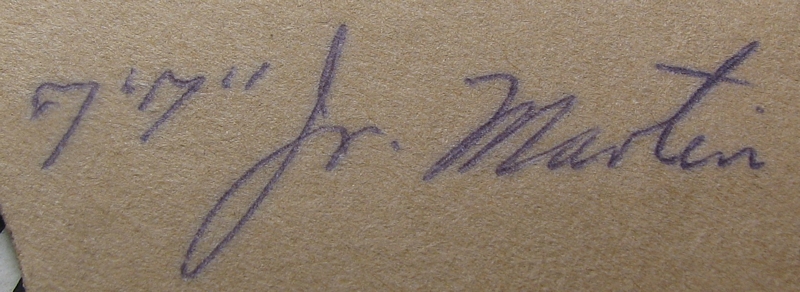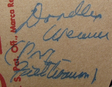 I found out that all these signatures are members of Spike Jones band about 1949. Frankie Little was a dwarf who did comedy routines. Gloria Gardner was one of two "Slickerettes" who introduced the band and sang and danced. Doodles Weaver was Professor Feetlebaum, and Jr. Martin was actually Lock Martin, Jr, a 7'7" giant who also did comedy routines. He also just happened to be the most important actor in the 1951 sci-fi thriller THE DAY THE EARTH STOOD STILL. He was the guy in the GORT costume! WOW!! THE DAY THE EARTH STOOD STILL is my all-time favorite sci-fi movie. It was the first with a story that didn't seem like it was adapted from a shoot-em-up western movie script. That is amazing, after over 60 years, I finally have Gort's autograph! ![]() This is a photo of Spike Jones with Frankie Little and Lock Martin, Jr (aka Jr Martin) ![]() This is a photo of Spike Jones with 4 Slickerettes. Gloria Gardner is on the left and her sister Gladis is on the right. This is a clipping from a 1949 newspaper. |