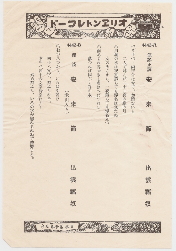 Below are some Japanese record inserts. These were inserted with Japanese 78 rpm records and describe what is on the record.